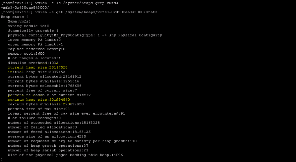 vsish -e ls /system/heaps | grep vmfs3 vsish -e get /system/heaps/”Output of above command”/stats